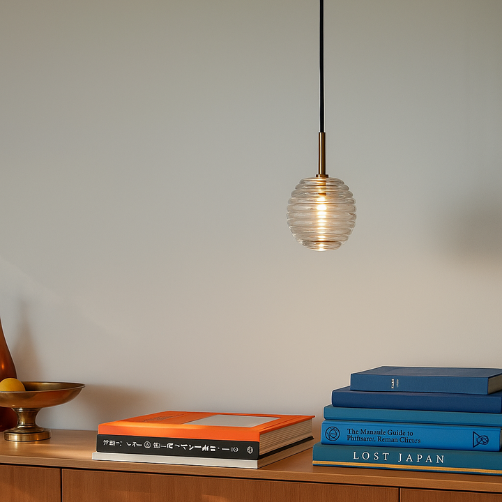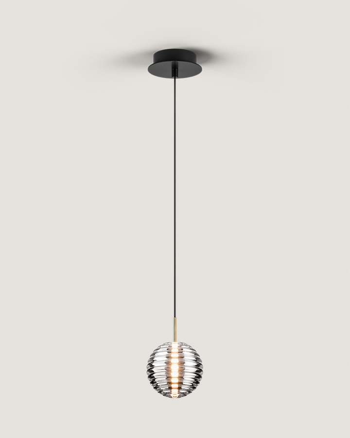 The Doul pendant elegantly translates the collection's signature design into a suspended form. Featuring the same beautifully ribbed glass sphere that defines the series, this pendant version creates an intimate pool of ambient light from above.