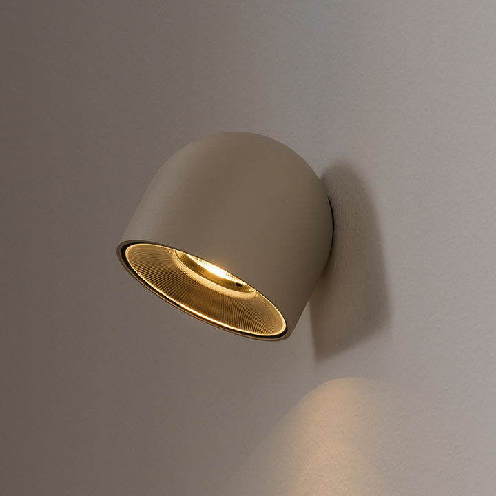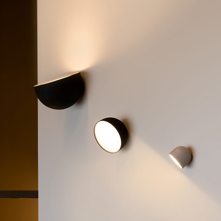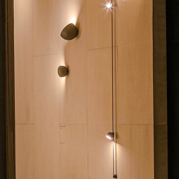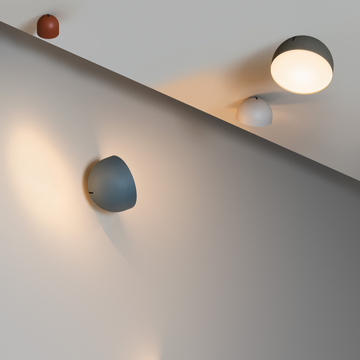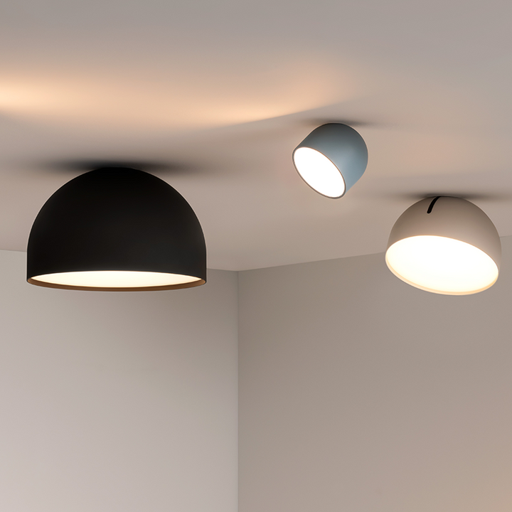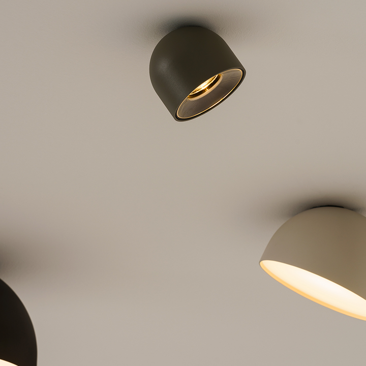 Plusminus Solo includes a range of surface mounted semi-circular ceiling lights. Combining accent spotlights with flat directed diffusers, the collection provides a comfortable general illumination as well as a more focused one.